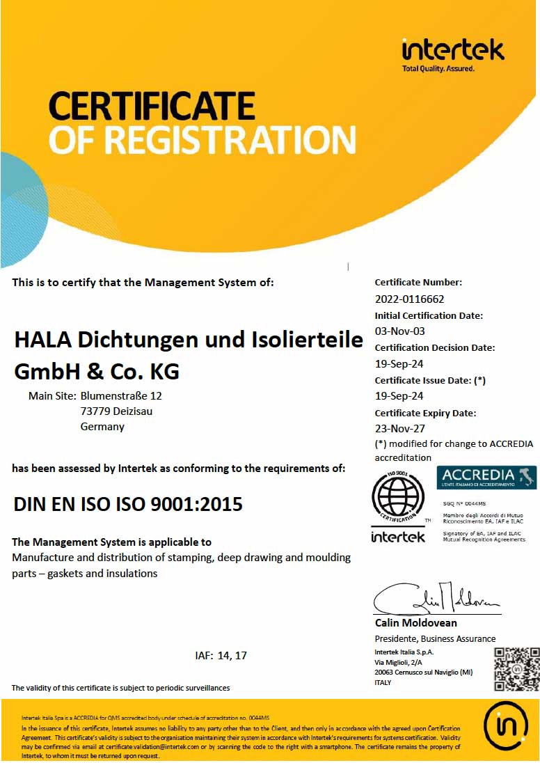 Hala is ISO 9001:2015 and IATF 16949:2016 certified.